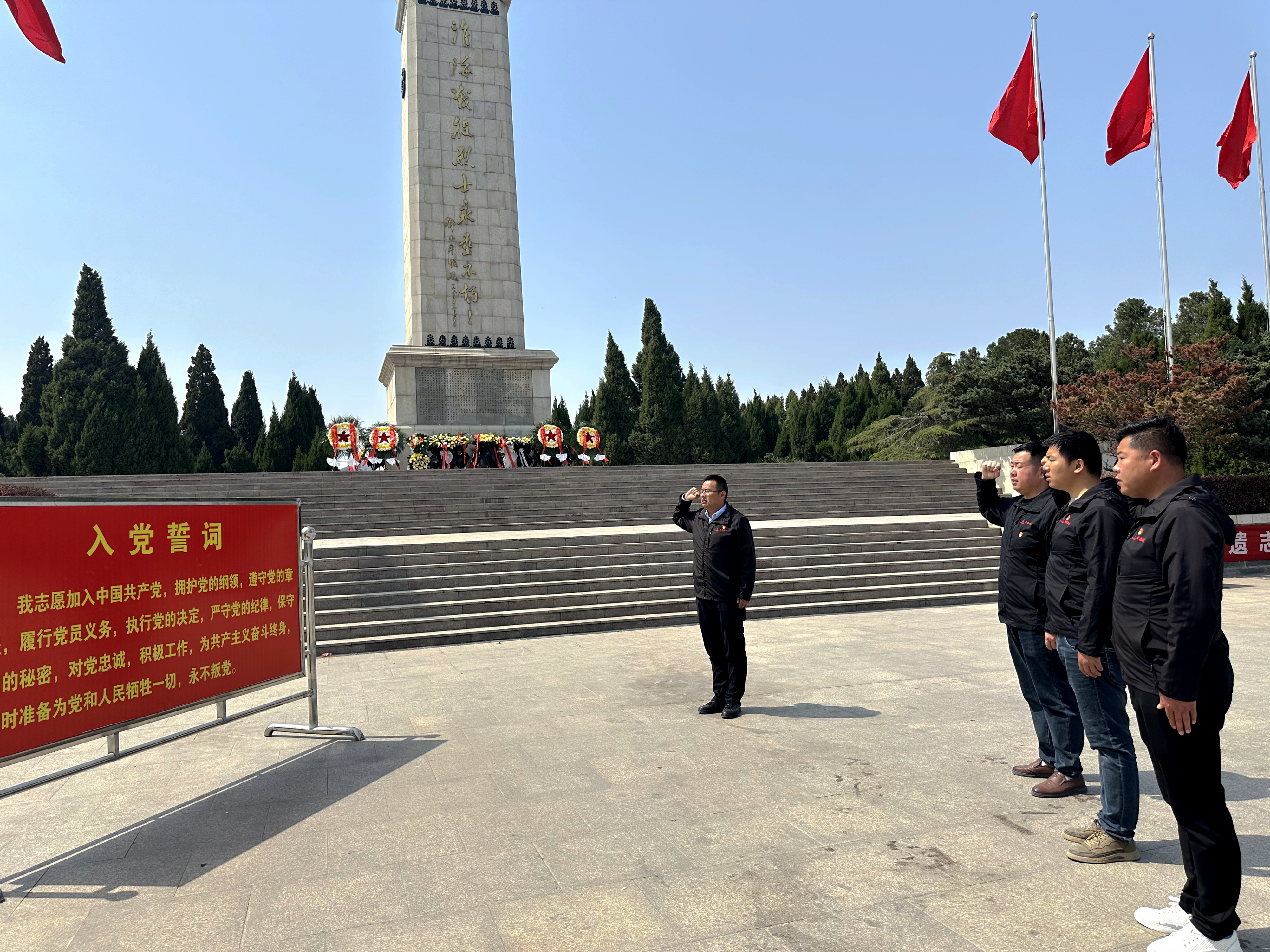 公司黨員、團員青年及職工代表前往屬地烈士陵園開展祭掃活動。松柏蒼翠映豐碑,全體人員肅立默哀,向革命烈士紀念碑敬獻花籃,鞠躬致意。面對鮮紅的黨旗,黨員同志們重溫入黨誓詞。