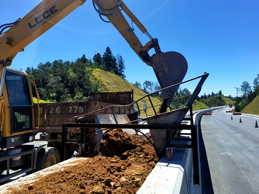 中分填土實現零污染。傳統高速公路中分帶培植用土施工,極易造成路面污染。為解決該難題,公司創(chuàng)新研發(fā)中分帶新澤西護欄間填土漏斗裝置,根據現場護欄尺寸、填土高度,制作填土漏斗,填土施工通過漏斗槽滑入護欄內部,避免外溢,同時漏斗可以在護欄頂部和側面自由滑動,實現中分帶填土零污染施工,有效保證路面清潔施工,較傳統工藝施工效率提高50%左右。