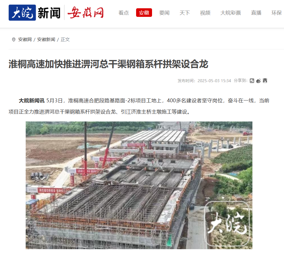 “五一”期間,公司承建的合肥新橋國際機場綜合交通中心項目、淮桐高速合肥段路基2標、S235濉唐路三期項目、徐淮阜高速淮北段項目、S20長固高速路基01標等一批項目“火力全開”,奮戰(zhàn)二季度,在江淮大地奏響項目建設“協(xié)奏曲”,受到央廣網(wǎng)、學習強國、安徽新聞聯(lián)播、大皖新聞等多家主流媒體的關注報道。