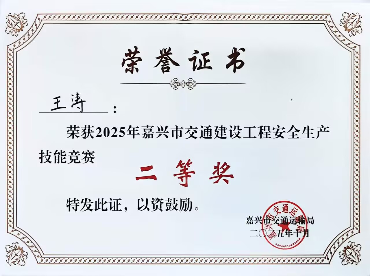 10月30日,由嘉興市總工會(huì)、嘉興市交通運(yùn)輸局聯(lián)合舉辦的2025年嘉興市交通建設(shè)工程安全生產(chǎn)技能競賽,在浙江分公司524國道TJ01標(biāo)項(xiàng)目圓滿舉行。項(xiàng)目精心選派的參賽選手王濤憑借出色發(fā)揮,榮獲二等獎(jiǎng)。